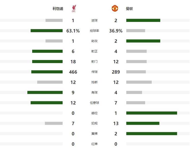 利物浦vs曼联全场数据:红军控球占6成,射门19-12