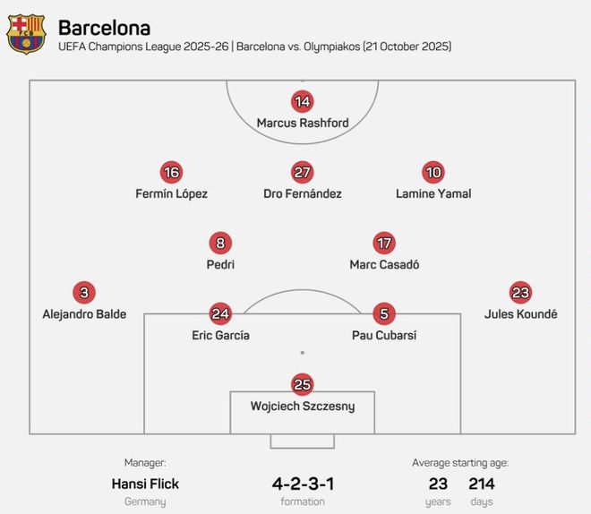 23岁214天!巴萨欧冠排出俱乐部队史第三年轻首发阵容