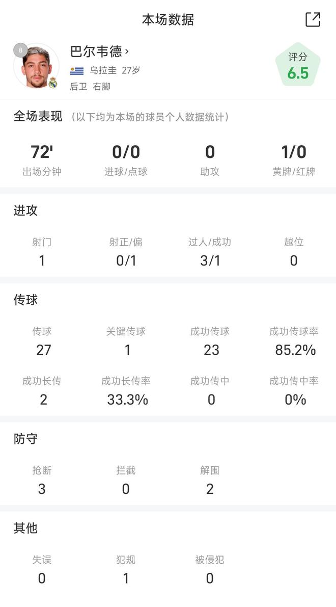 巴尔韦德国家德比数据:3抢断、2解围、传球成功率85%